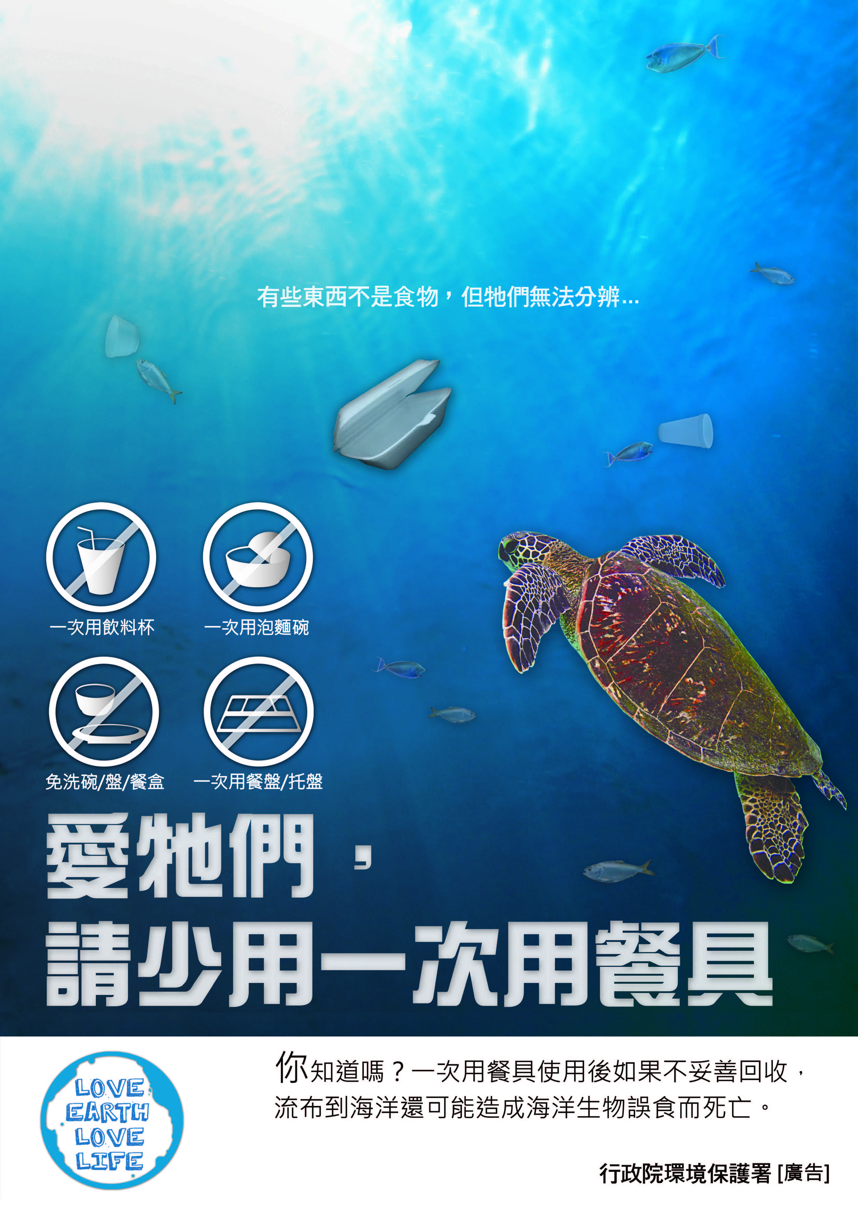 函轉行政院環境保護署設計之3款一次用產品減量宣傳海報檔案,歡迎索取宣傳。「少用一次用餐具」