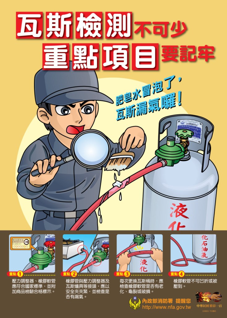 4. 其餘關於瓦斯安全之注意事項可至消防署網頁查看及參考http://www.nfa.gov.tw/main/Unit.aspx?ID=&MenuID=513&ListID=348。