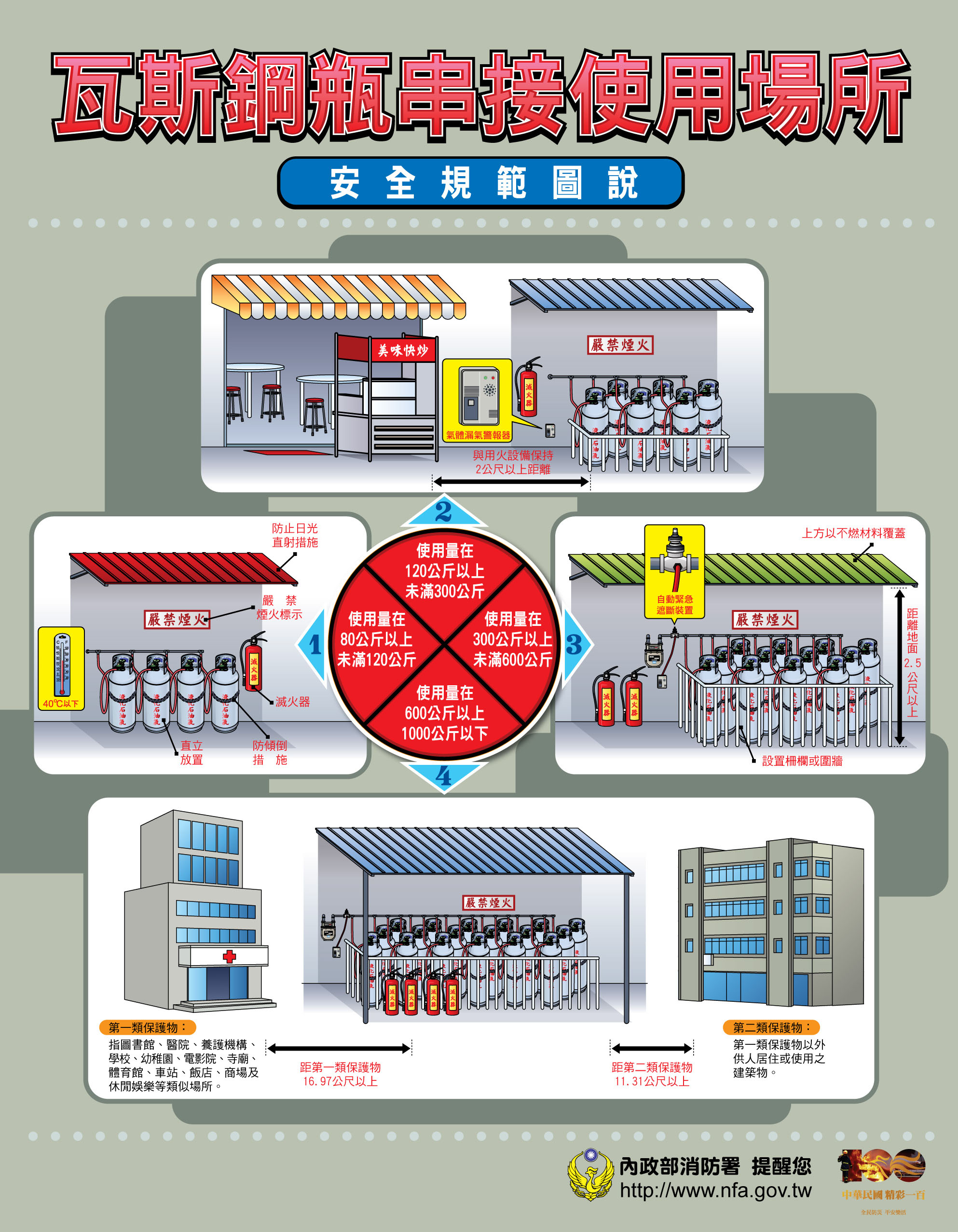 3. 上述法規說明之瓦斯串接使用場所規定可參考附件消防署「瓦斯鋼瓶串接安全規範圖說」,請依照設置瓦斯的使用量執行相關防護措施、遮斷裝置、洩漏警報與執行定期自主檢查。
