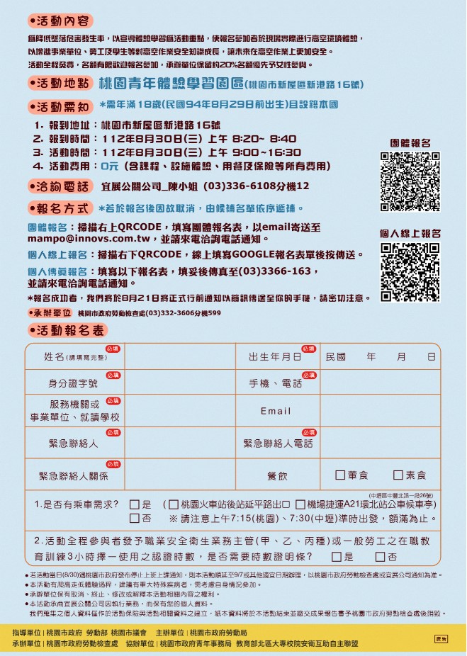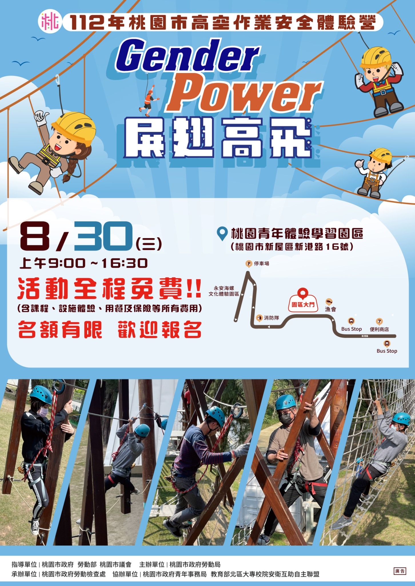 桃園市政府勞動檢查處「112年桃園市高空作業安全體驗營」活動資訊,請踴躍報名。