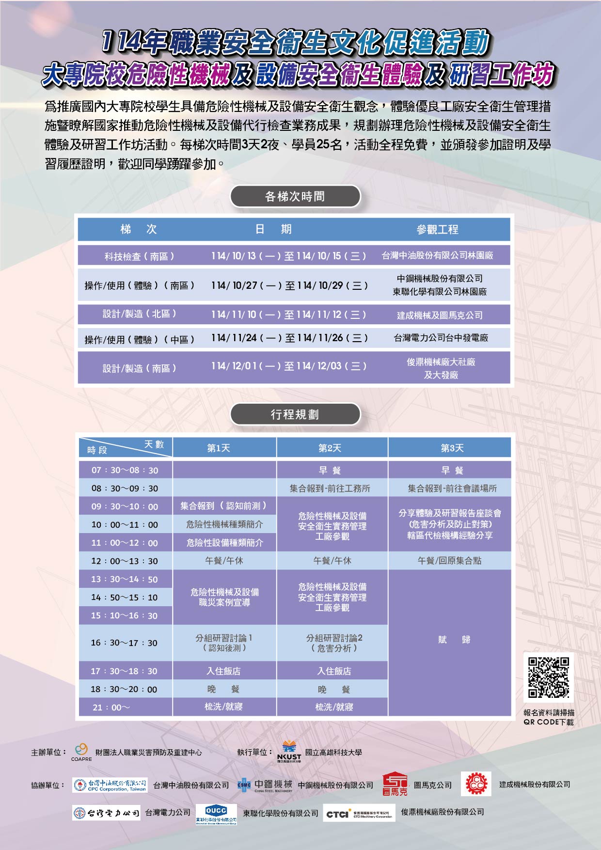 主旨:本校承辦財團法人職業災害預防及重建中心主辦之「114年職業安全衛生文化促進活動-大專院校危險性機械及設備安全衛生體驗及研習工作坊」,每梯次營隊期程三天兩夜,全程免費。敬請鼓勵貴校機械工程、電機工程、職業安全衛生、消防、土木工程、營建工程、建築工程等相關科系及研究所學生參加,並協助安排學生請假事宜,請查照。