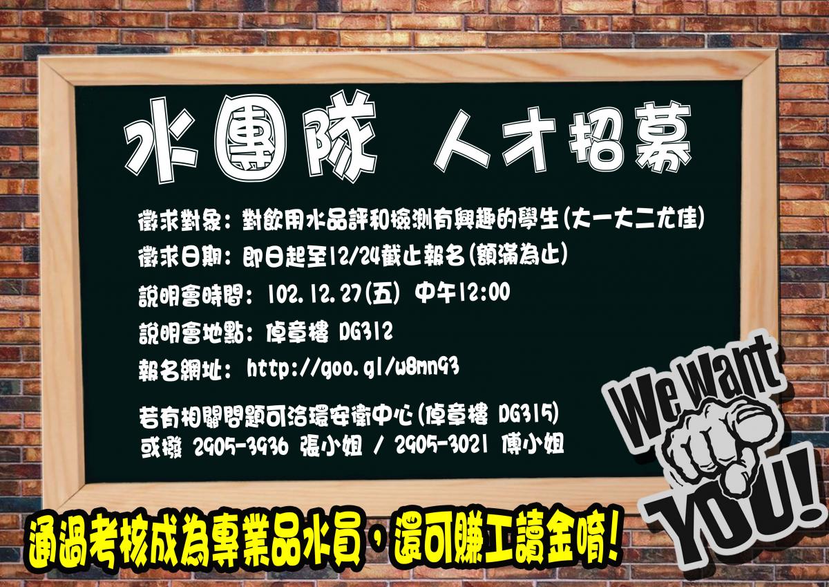 徵求102學年度輔大水團隊小隊員,請有興趣者於12/24中午前報名唷!