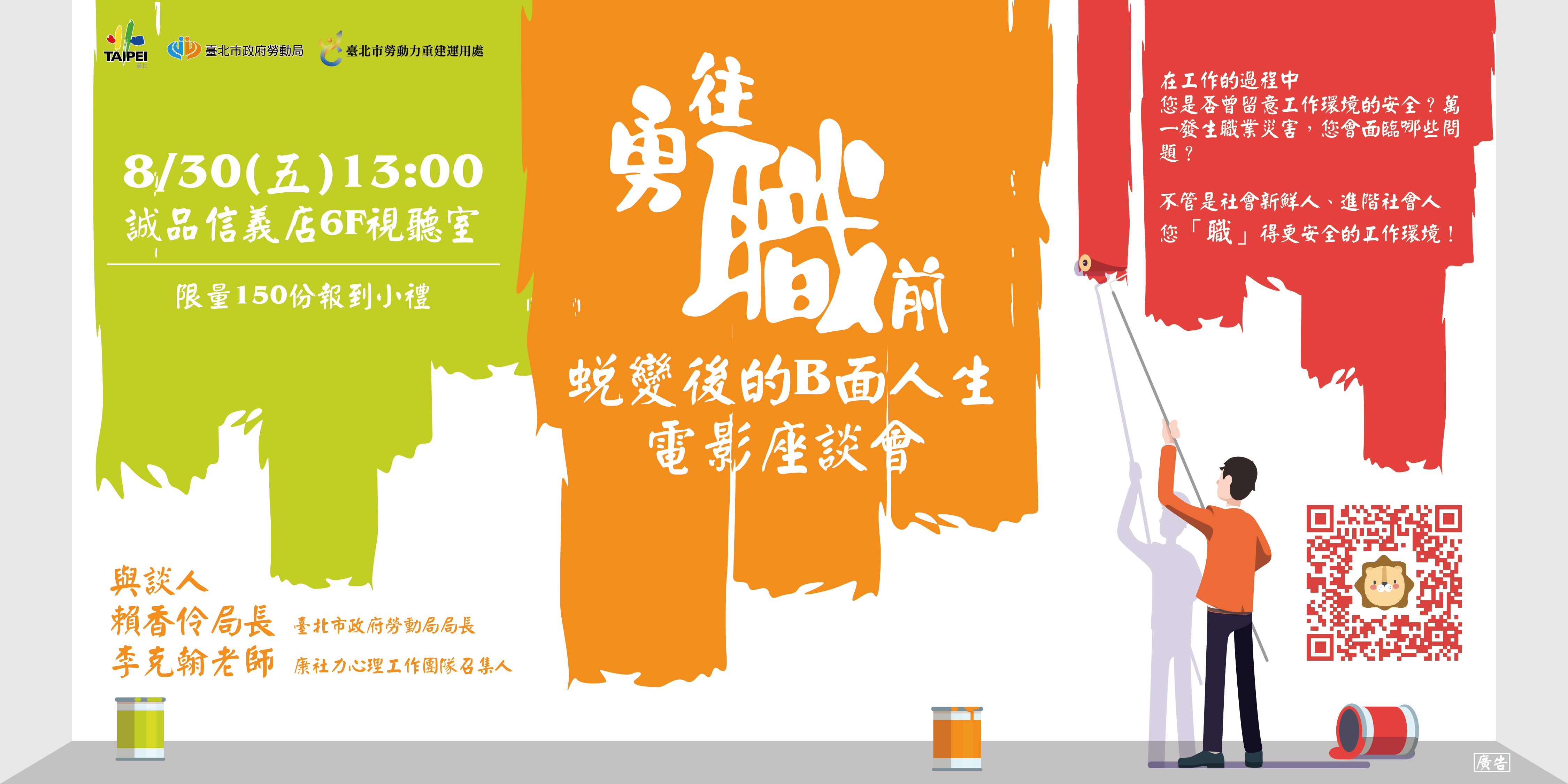 一、臺北市勞動力重建運用處為提升一般大眾對工作安全及職業災害勞工服務之認識,於8月30日(星期五)下午1時0分假信義誠品6樓視聽室(信義區松高路11號6樓)舉辦「勇往職前 蛻變後的B面人生」電影座談會,現場播映電影「B面人生」,映後座談會邀請勞動局賴香伶局長及康社力心理工作團隊召集人李克翰老師,帶領與會者分享隱藏的職災危機、職災發生後勞工所需面臨的生理、心理、家庭及社會的適應問題。